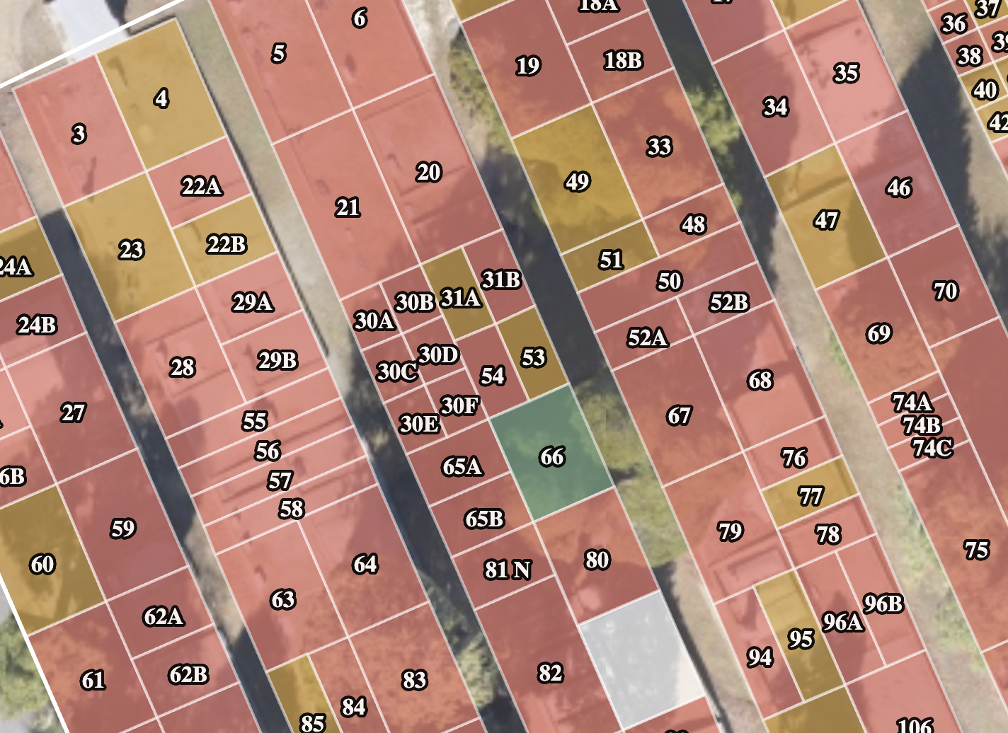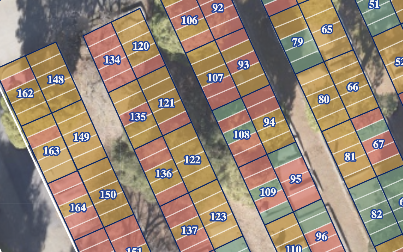 In this example, each lot is subdivided into its individual grave spaces within Cemify. The layouts are generally consistent, which makes it straightforward to map each interment space one by one.